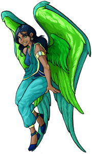 Kalu serves as the messengers, harbinger, and voice for The Mirror at times when He himself is not quite available. Her job may be anything from speaking to other mortals, to retrieving non-followers so that He may speak to them, or visiting other Deities with messages or requests. Kalu may spend much of her off-time either in the Realm or sitting on the shoulder of her Dama as she travels with him.